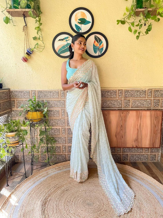 Teal & White Floral Embroidered Sequinned Poly Georgette Saree