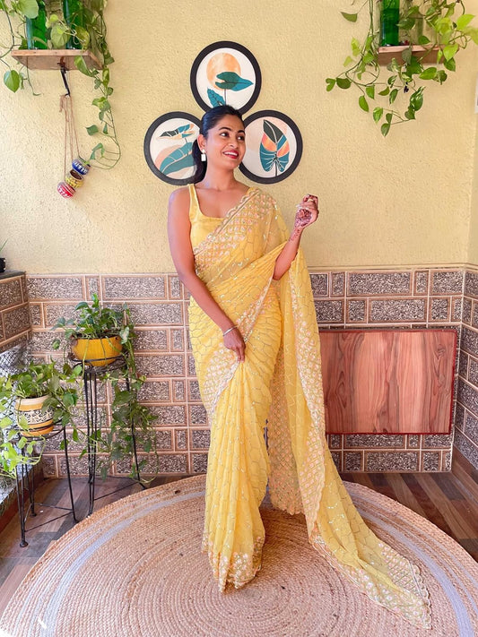 Sunshine Yellow Georgette Saree, Festive Ready Look with Elegant Sequin Embroidery, Perfect for Haldi & Day Events