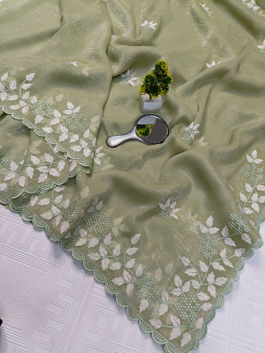 Bring elegance to your wardrobe with this beautifully handcrafted pastel green organza saree. Designed for the modern woman who admires traditional charm, this saree features delicate white and mint thread embroidery in graceful floral and leaf motifs. The finely scalloped lace border adds a refined touch, making it ideal for festive celebrations, casual gatherings, or day-time functions.