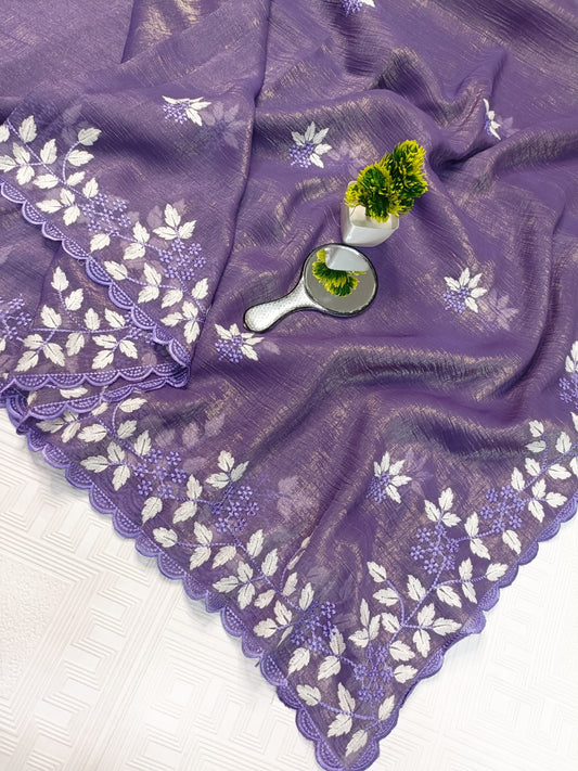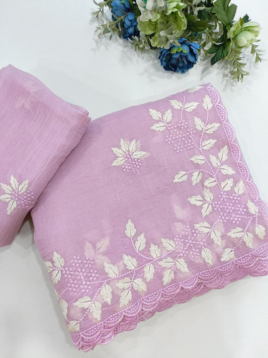 Lavender Soft Organza Saree with White Leaf Embroidery Elegant Scallop Border Saree for Festive & Party Wear | Unstitched Blouse