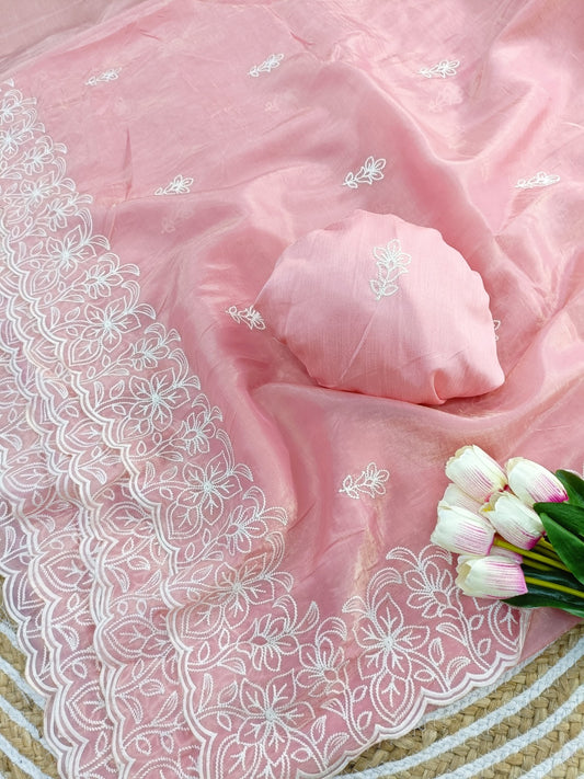 Blush Pink Soft Silk Saree with White Floral Thread Embroidery Elegant Lightweight Saree for Festive & Wedding Wear – Unstitched Blouse