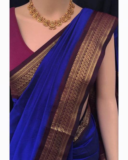Bring home the charm of artistry with this exquisite navy blue silk saree, adorned with colorful tree motifs and a traditional gold zari woven border. Its blend of playful design and rich detailing makes it a beautiful choice for cultural functions, festive wear, or even graceful gifting.Style it with minimal gold jewelry for a modern yet rooted ethnic ensemble.