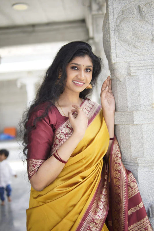 Narayan Pattu Maroon and Yellow Semi Silk Saree | Peacock Jari Border | Saree with Blouse