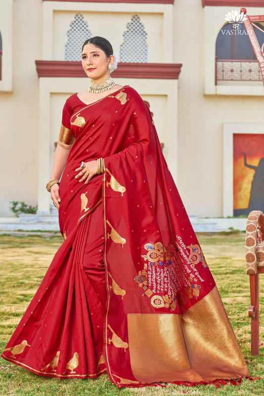 Chilly Red Malai Silk Saree with Woven Sanskrit Mantra Pallu, Inspired by Nita Ambani’s Iconic Style