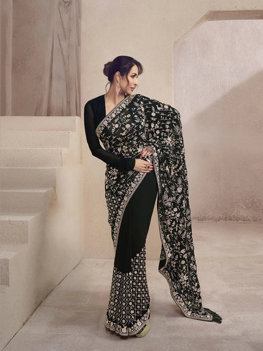 Black Georgette Embroidered Saree, Bold Party Wear Look, Elegant Evening Drape with Floral Detailing
